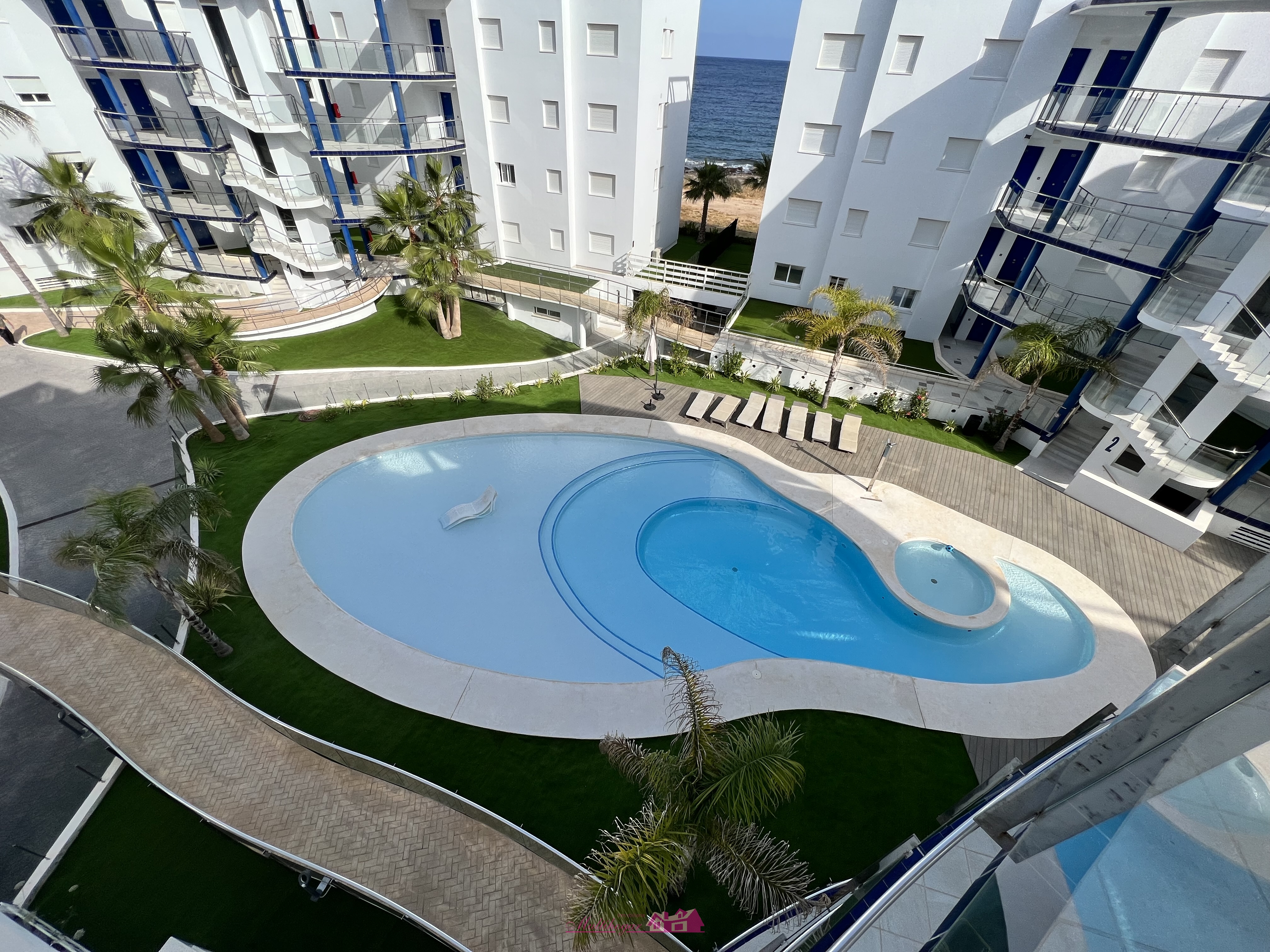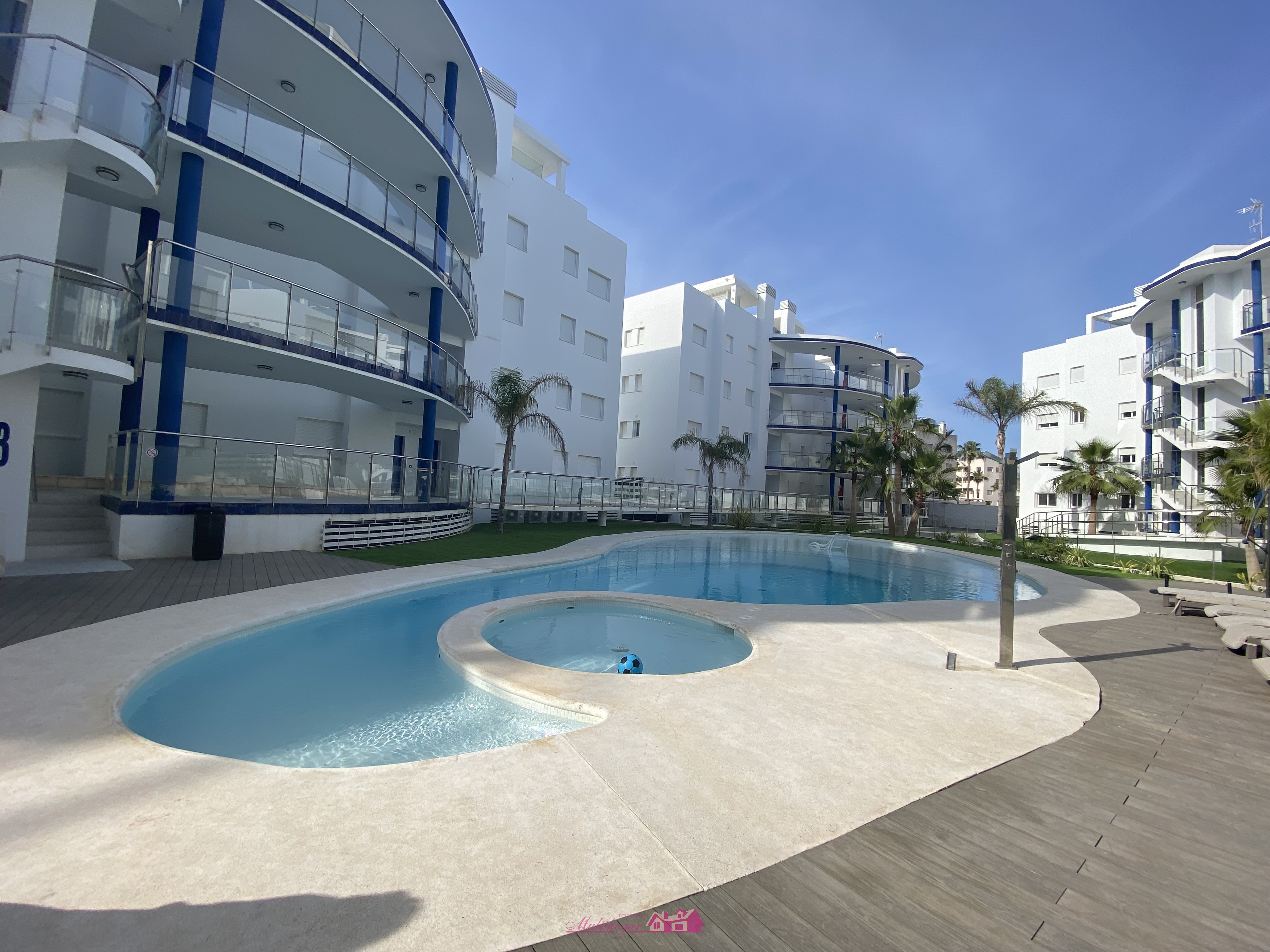 Dispone de amplias zonas comunes y jardines con palmeras, piscina comunitaria con área de tumbonas con cuidada vegetación que le da mayor privacidad a la zona y acceso directo al mar a través de las pasarelas de madera que conectan con la playa, localizada a pocos metros de los apartamentos. La comunidad cuenta con servicio de conserje y cámaras de seguridad.